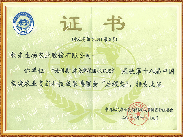 施利康牌含腐植酸水溶肥料—第十八屆中國楊凌農(nóng)博會(huì)“后稷獎(jiǎng)”